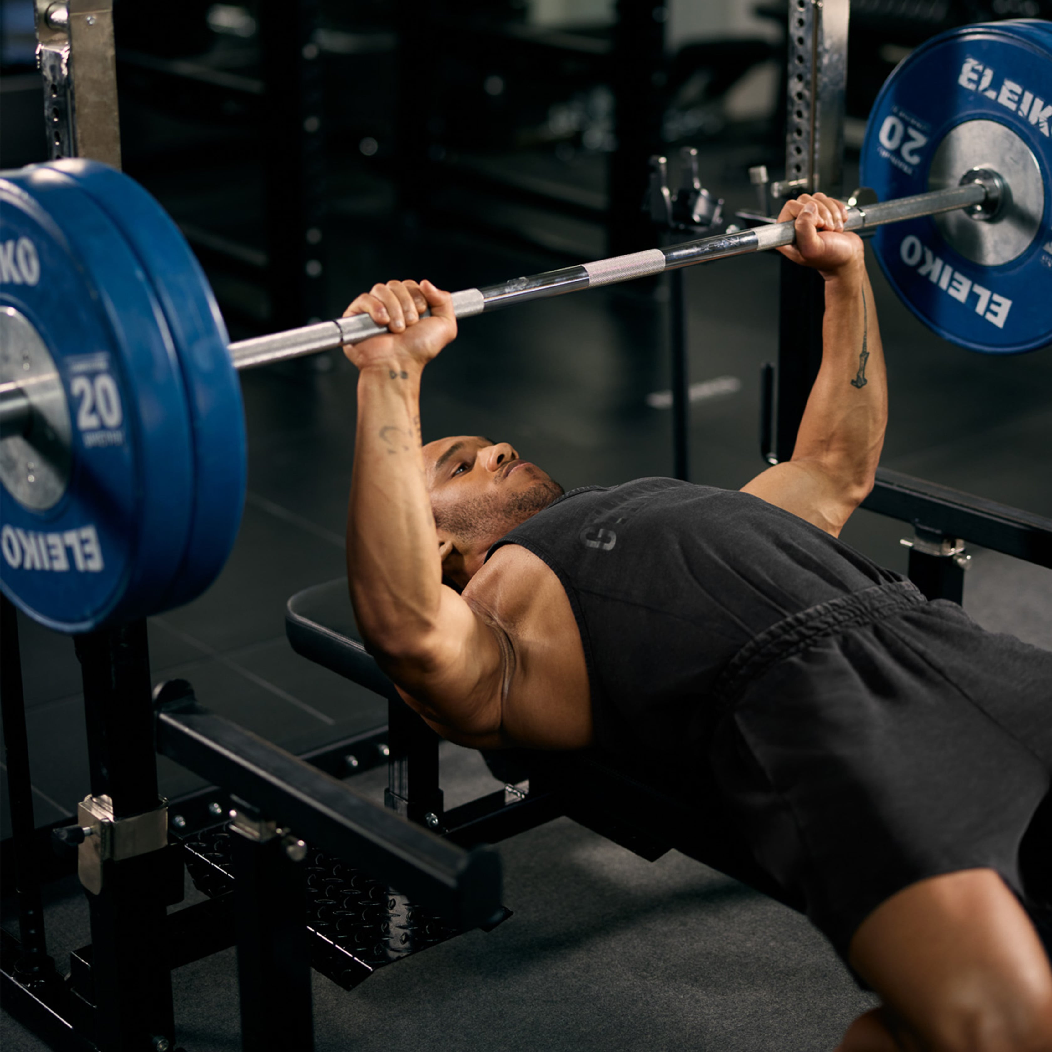 Lie flat on the bench with your eyes directly under the bar. Your feet should be flat on the floor, your back against the bench, and your shoulder blades pulled back and down.