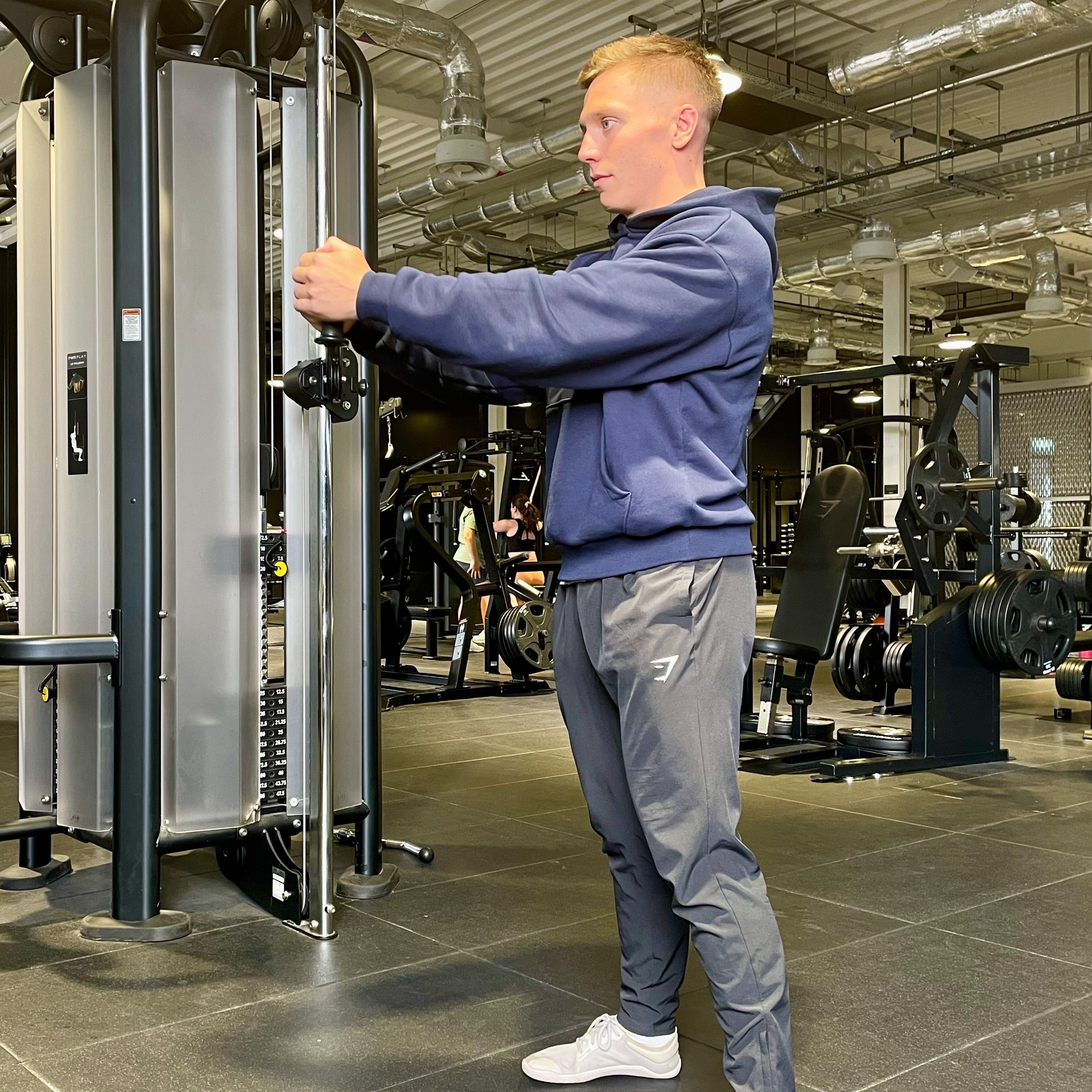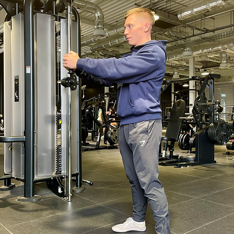 1. Move the cable to chest height and attach the handle attachment. Select a light weight on the cable stack.