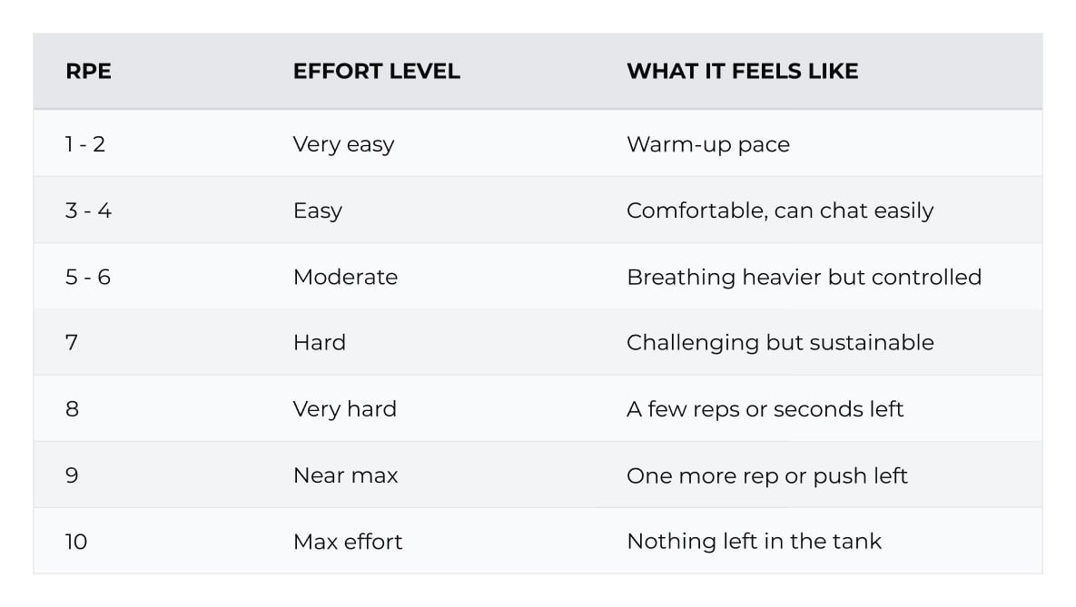 RPE stands for Rating of Perceived Exertion, and it’s a scale used to measure how hard exercise feels during a set, a run, or a whole session. At the lowest end, something like a warm-up or light mobility work would sit around an RPE 1.
