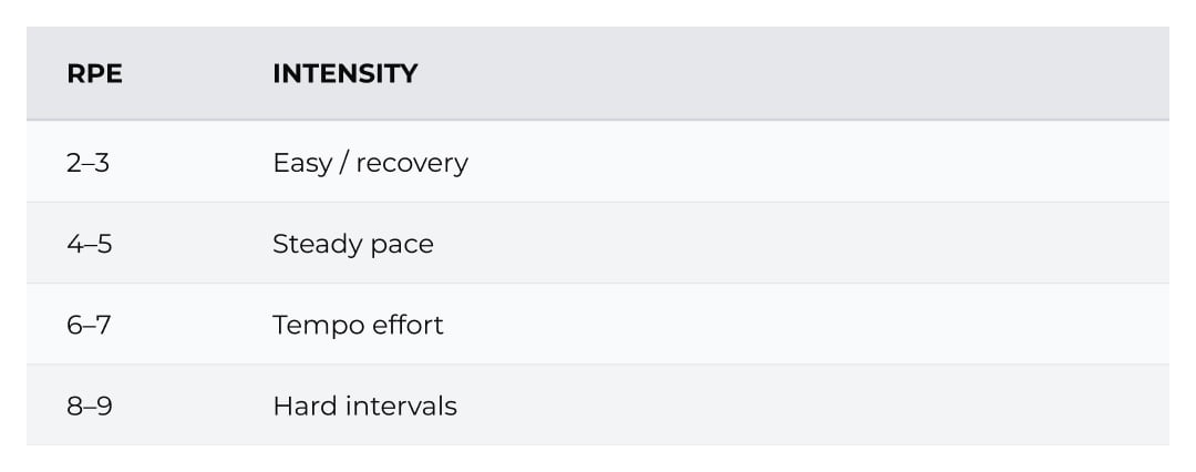 We tend to group intensity for running into zones. If you head out for a steady long run at RPE 4-5, you’re looking for a pace where your breathing is elevated but still controlled. You could hold a conversation, but it wouldn’t be effortless. Push up to RPE 7, and that conversation turns into shorter phrases. By the time you hit RPE 8 or 9, you wouldn’t be able to talk as you’re nearing your threshold effort.
